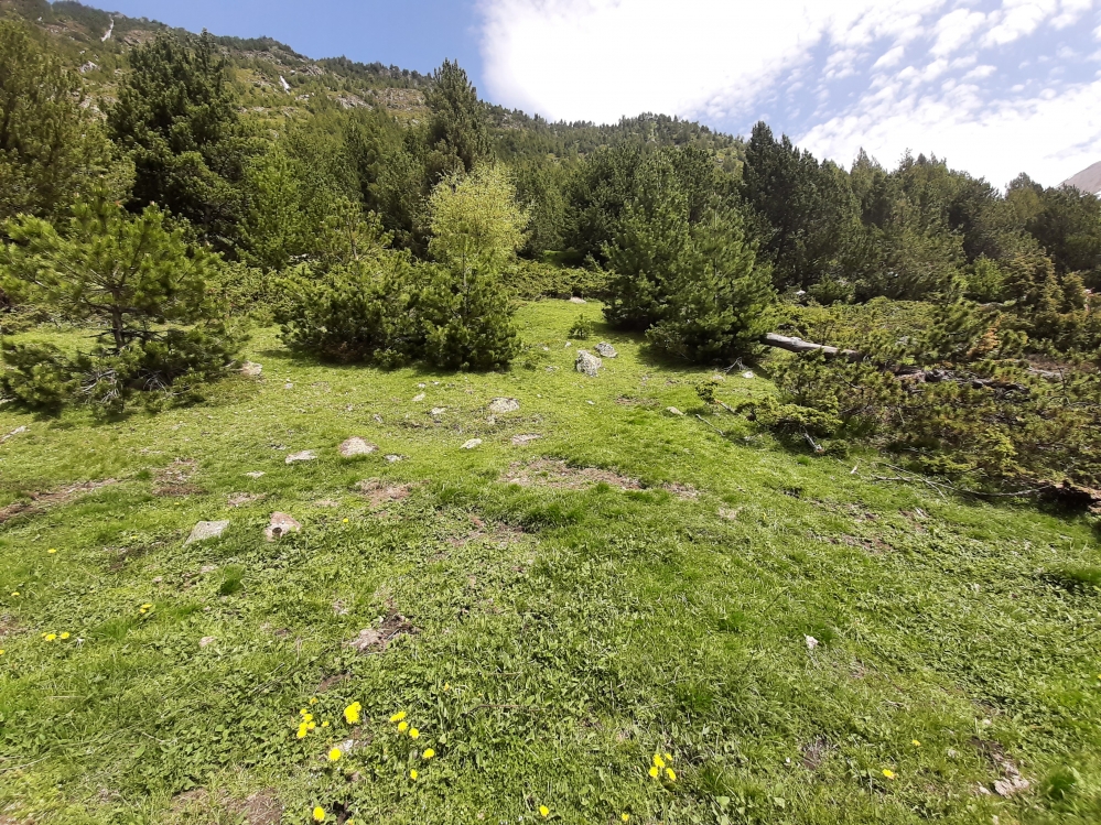 Parcela ubicada en un hábitat mixto de prado subalpino y bosque de pino negro (Pinus uncinata) que se combina con la presencia de matorrales aislados de Juniperus sp. y Rosa canina. La parcela queda delimitada entre dos arroyos de deshielo que la recorren verticalmente y dos pistas forestales que la cierran horizontalmente.