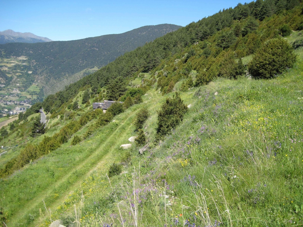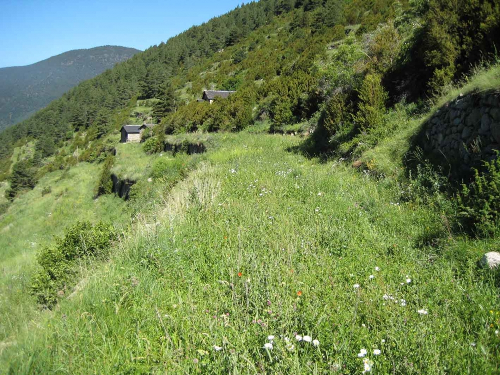 Parcela situada en unos bancales recubiertas por vegetación herbácea y arbustiva, a una altitud de 1726 m.s.n.m. (piso montano). La parcela presenta dos estructuras de vegetación que varían gradualmente: 1) el prado de siega, que cubre la parte inferior de la parcela con recubrimientos máximos del 90%, y 2) un matorral de boj que logra coberturas del 45% . El estrato arbóreo es casi ausente, y las rocas están presentes en los muros que separan las diferentes bancales.