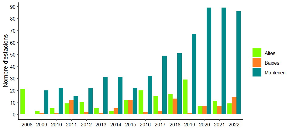 Si consulteu el mapa de la localització de les estacions, veureu on estan situades i qui n’és el responsable. L’any 2021 va ser el primer en què es va arribar al centenar d’estacions actives de forma simultània.